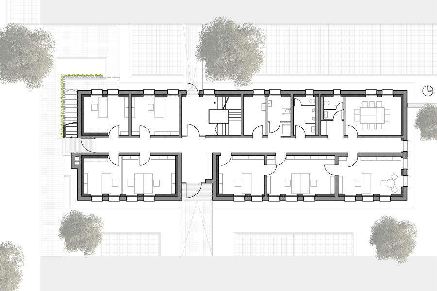 Ziel der Energetischen Sanierung war es, eine einfache und pragmatische Maßnahme durch ein nachhaltiges Energiekonzept zu erarbeiten, um mit einer möglichst geringen Technisierung und Nutzung der Speicherfähigkeit des massiven Baukörpers auf eine herkömmliche Dämmung im Bereich der Wände verzichten zu können, Wärmebrücken zu optimieren und Pufferzonen zu nutzen. Durch eine ausgiebige Simulation war es möglich, den Wärmeschutz mit einer massiven Bauweise, statt einer herkömmlichen Dämmung zu gewährleisten. Folglich wurde die bestehende Außenwand lediglich mit einer zweiten, innenliegenden Mauerschale ergänzt und ein Wärmedämmputz auf die bestehenden Außenwände aufgetragen.