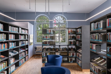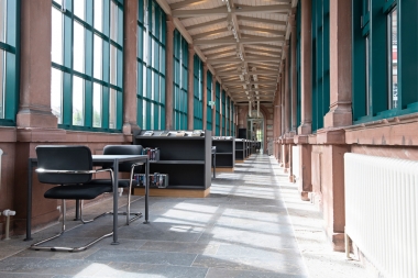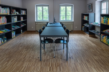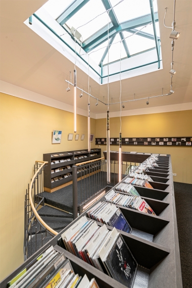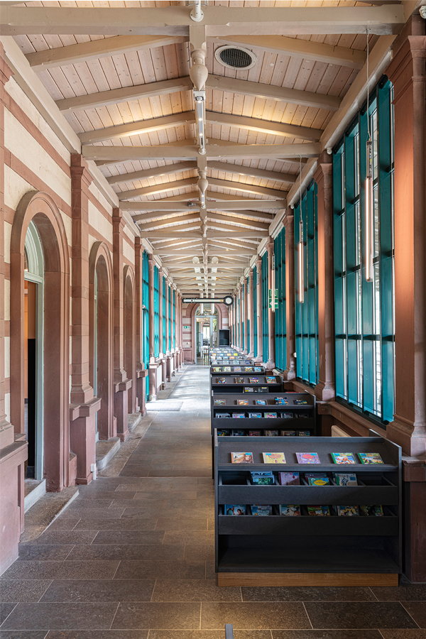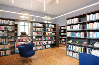 Die denkmalgeschützte Bücherei mit ihrer heterogenen Raumstruktur, unterschiedlich großen und hohen Räumen sowie zwei langen, verglasten Fluren, ehemals Bahnsteige, erstreckt sich über zwei Geschosse und sollte anlässlich des 30 jährigen Bestehens generalsaniert werden.