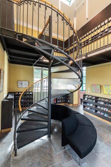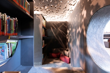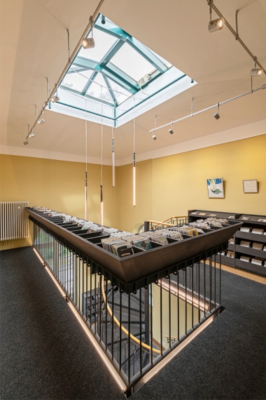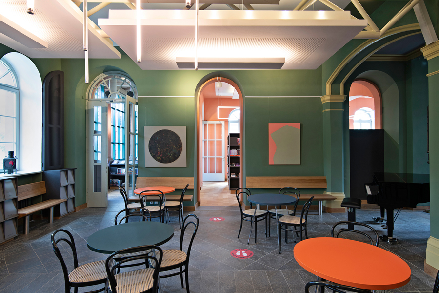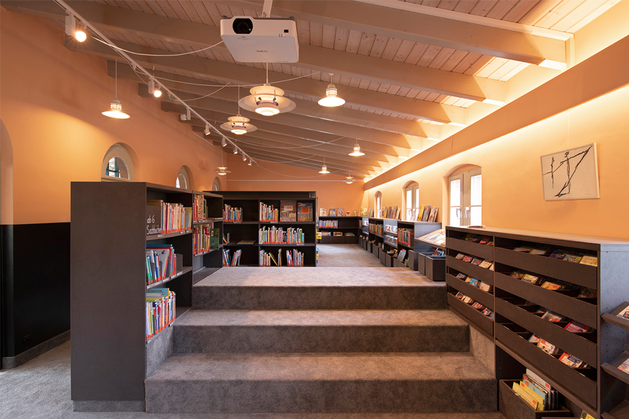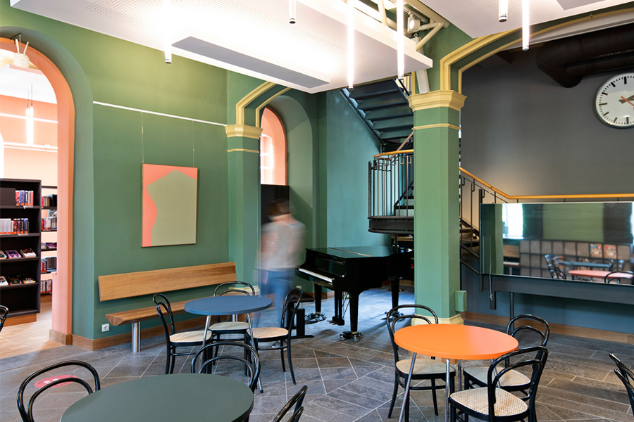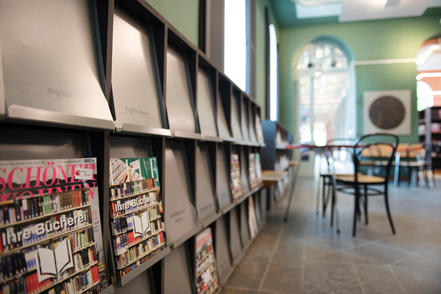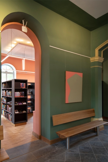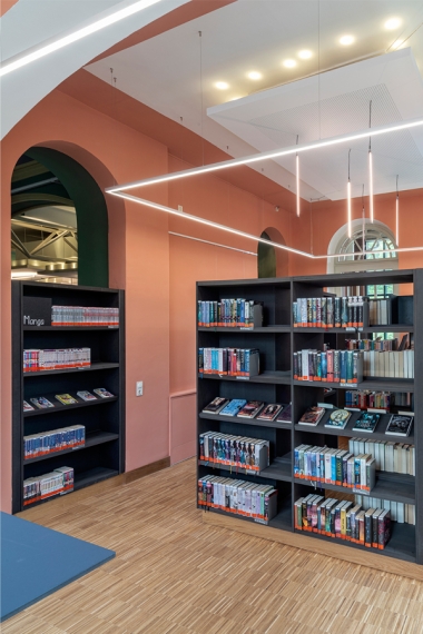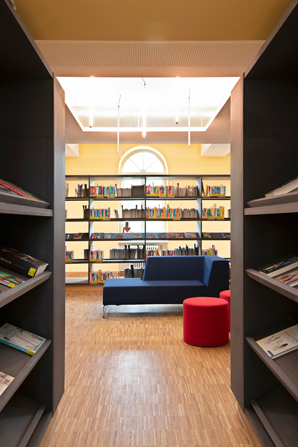 Bis ins Detail wird auf das Bestehende in jedem einzelnem Raum reagiert, um eine individuelle, denkmalgerechte Atmosphäre in jeder Abteilung zu schaffen. So sind die Rückenschilder der Bücher und Flyer der Bücherei Grundlage für die Farbgebung und Inhalt jeder Abteilung, egal ob Belletristik, Sachbuch, Jugend- oder Kinderabteilung. Die kreative Farbgestaltung, mit teilweise kräftigen und gleichzeitig erdigen Farben, unterstreicht den neuen Raumeindruck. Sämtliche Räume werden durch abgehängte Deckensegel und senkrechte Stableuchten, die „Kronleuchter“ eines jeden Raumes, akustisch ertüchtig und aufgewertet. Das Geländer des Treppenpodestes im zentralen Lesecafé, das einer Wiener Caféhaustradition mit seinen runden Tischen und Zeitungsständen nachempfunden ist, wird klappbar montiert, sodass in wenigen Handgriffen eine Bühne für Lesungen oder Veranstaltungen, auch ausserhalb der Öffnungszeiten, entsteht. Die Bibliothek neu definiert als Bühne, Caféhaus, Arbeitsplatz, Spielplatz und Treffpunkt für Jung und Alt.