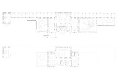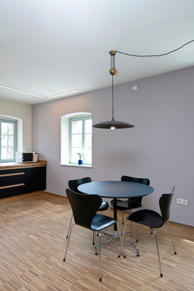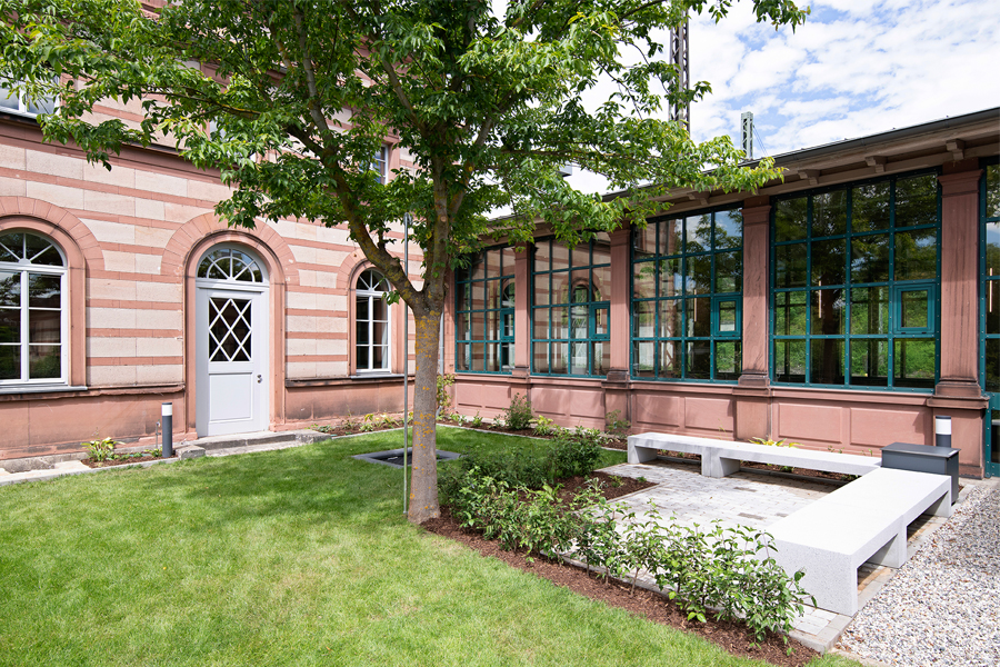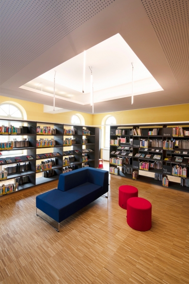 Leitmotiv der Sanierung ist der benachbarte Rokokogarten mit seinen Formschnitthecken als Grundlage für Anordnung, Form und Verlauf der Regale in der Bücherei. Folglich werden die Regale nicht klassisch entlang der Wände aufgestellt, sondern inmitten des Raumes, als raumbildende Elemente um das Raumzentrum, wodurch „Raum in Raum“ Situationen mit offenen sowie geborgenen Räumen entstanden. Auch kann durch diese Anordnung der Regale die Regalfläche verdoppelt, die Medien von zwei Seiten sichtbar aufgestellt und die Außenwände als Art „Galeriefläche“ mit Bilderleisten genutzt werden.