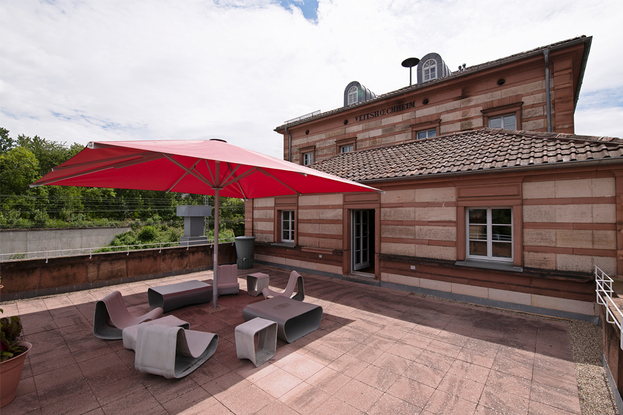 Im 18. Jahrhundert errichteten die Fürstbischöfe von Würzburg ihre Sommerresidenz mit Rokokogarten in Veitshöchheim. Der nahegelegene Bahnhof wurde 1854 somit zum „Ausflugsbahnhof“, mit großer Empfangshalle und Königspavillon in der Hauptachse zum Eingang der Residenz. Nach Schließung des Bahnhofs und Erwerb des imposanten, zweifarbigen Sandsteingebäudes durch die Gemeinde Veitshöchheim, wurde 1990 die Bücherei im Bahnhof eingeweiht.