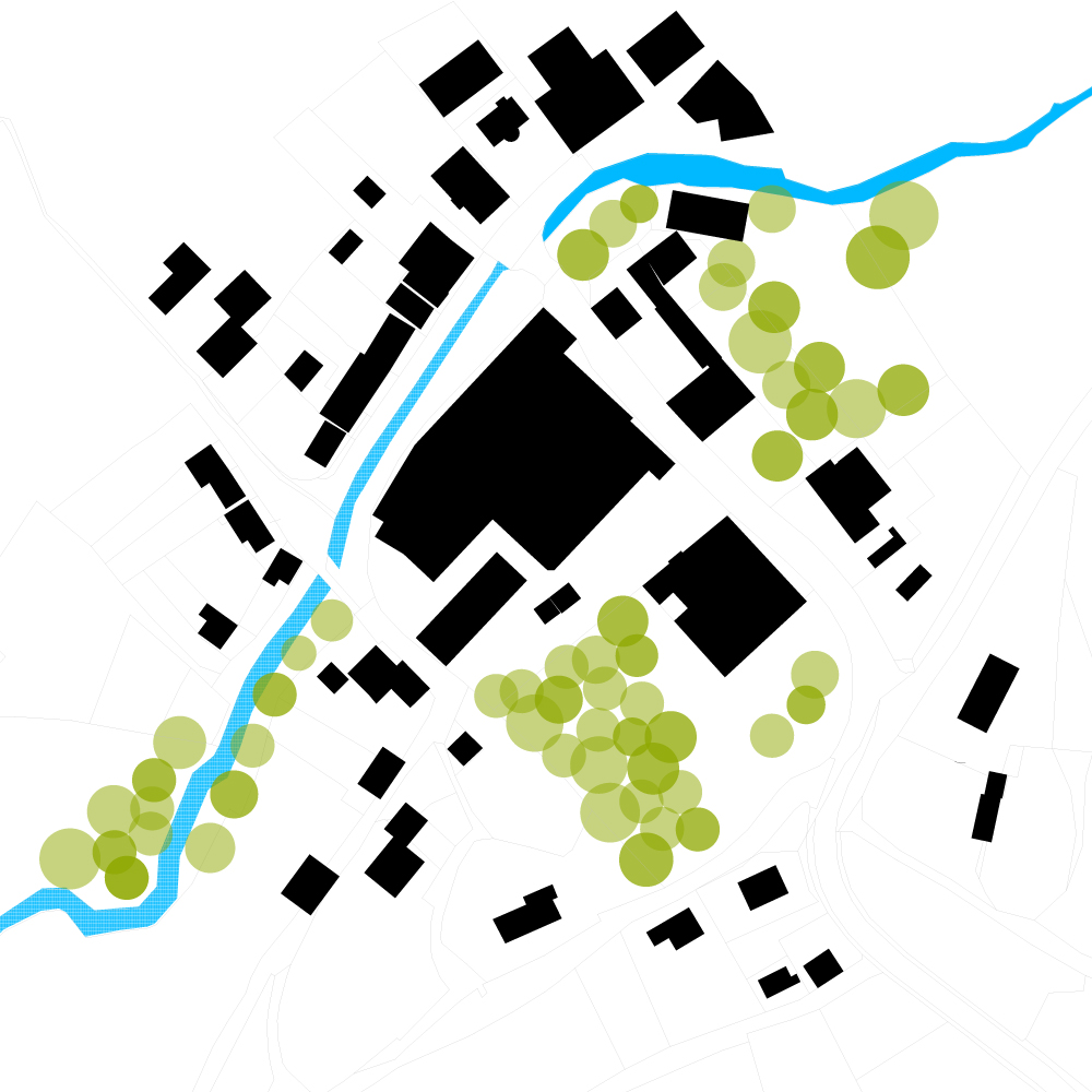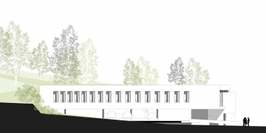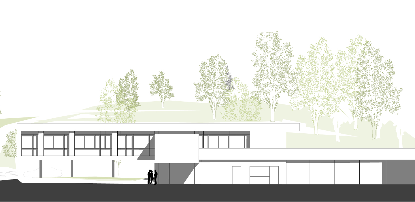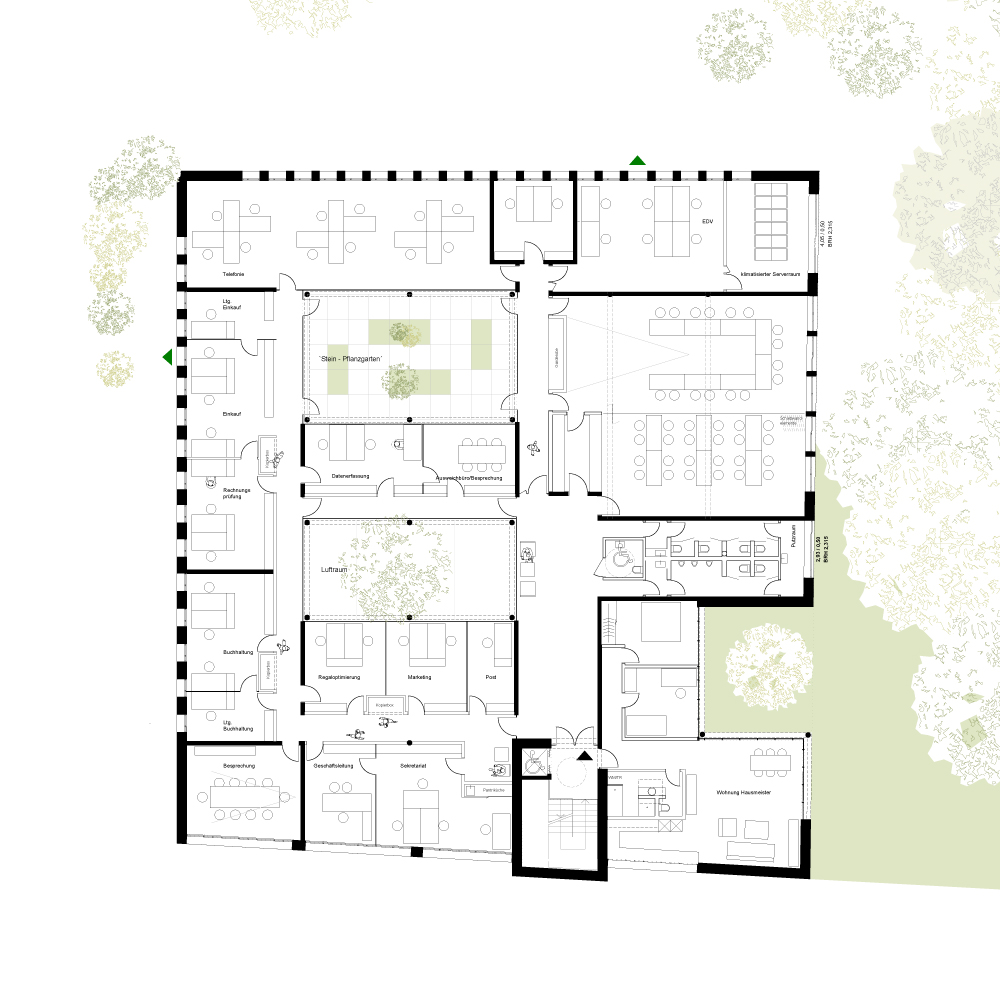 Die Hauptverwaltung eines modernen Logistikunternehmens soll in eine schwierige Topographie und ein denkmalgeschütztes Ortsbild integriert werden. Durch Eingraben in den Hang, der über das Dach des neuen Gebäudes wachsen wird und Anordnung der KFZ Stellplätze unter diesem Gebäude, orientiert sich die Nutzung, im Wesentlichen, nach Innen auf die begrünten Innenhöfe.