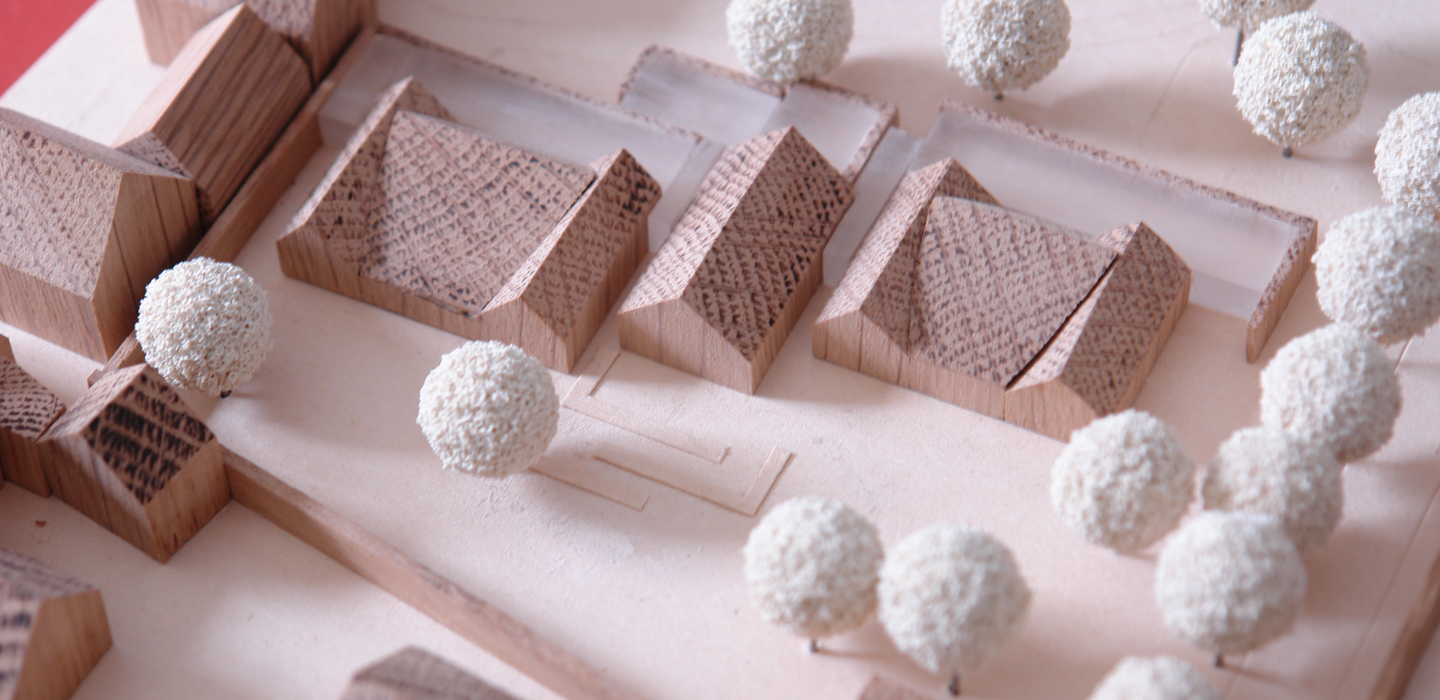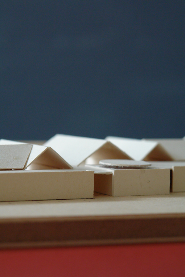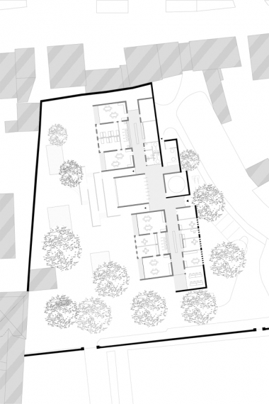 Es entsteht ein Haus der Begegnung, strukturiert wie ein Dorf im Ort. Eine Strasse und Wege führen über einen Platz, an dem die halböffentlichen Nutzungen, Mehrzweckraum und Raum der Stille liegen. Dieser Platz ist durch notwendige Brandschutztüren von den Fluren zu den Bereichen der Kinder abtrennbar. So können diese Räume auch außerhalb der Kindergartenzeiten von allen Mitgliedern der Gemeinde genutzt und belebt werden. Entlang der sog. Strassen liegen die Hausgruppen der Kinderkrippe und des Kindergartens, gleich daneben die Schulkindbetreuung. Schulkinder und Kindergartenkinder, die gestern noch zusammen gespielt haben, bleiben in Kontakt, sind Freund und Vorbild einander. Die Kleinkinder der Krippe liegen am anderen Ende der Strasse, für sich, abgeschieden vom wilden Toben der größeren Kinder. Die gedeckte Strasse ist der Bereich der Begegnung, des gemeinsamen Spiels.